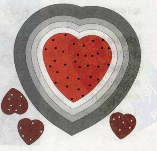 问题:如图所示,大的心形图案上有很多钉子(在图中用黑色的圆点表示),3个小的心形图案上各有一些小孔(在图中用白色的圆点表示)。现在请你将这3个小的心形图案覆盖到中间的大的心形图案上,尽量让这些小孔能够覆盖最多的钉子。提示:可以将3个小的心形图案旋转之后再覆盖上去。