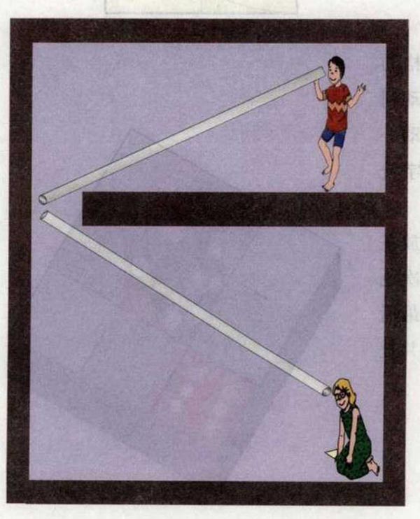 答案:声音的传播跟光一样,也遵循反射定律。如下图所示,当两根管子跟墙所成的角度分别相等时,两个孩子就能够听到对方讲话。声波反射到墙面上,然后再通过墙反射进管子。